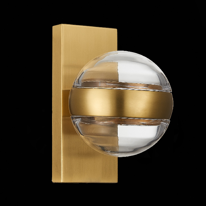 Каркас бра выполнен из качественного металл, цвет корпуса - латунь, цвет плафона - прозрачный, что придает этому светильнику гармоничности.