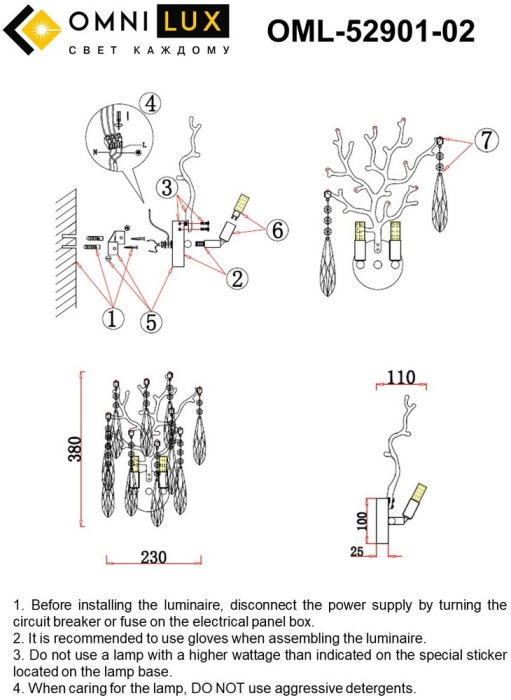 Бра OML-52901-02 имеет прекрасные размеры – ширина 270 мм., высота 370 мм., что позволяет ему прекрасно подойти для комнаты с подходящими габаритами и площадью освещения до 2 квадратных метров.