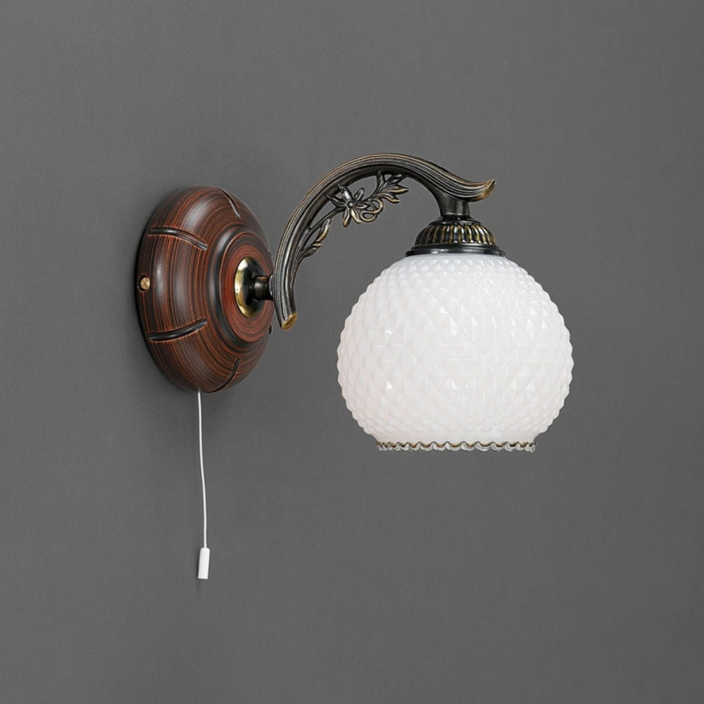 Корпус настенного светильника выполнен из качественного металл, цвет каркаса - бронза, цвет плафона - белый, что придает этому светильнику благородности.