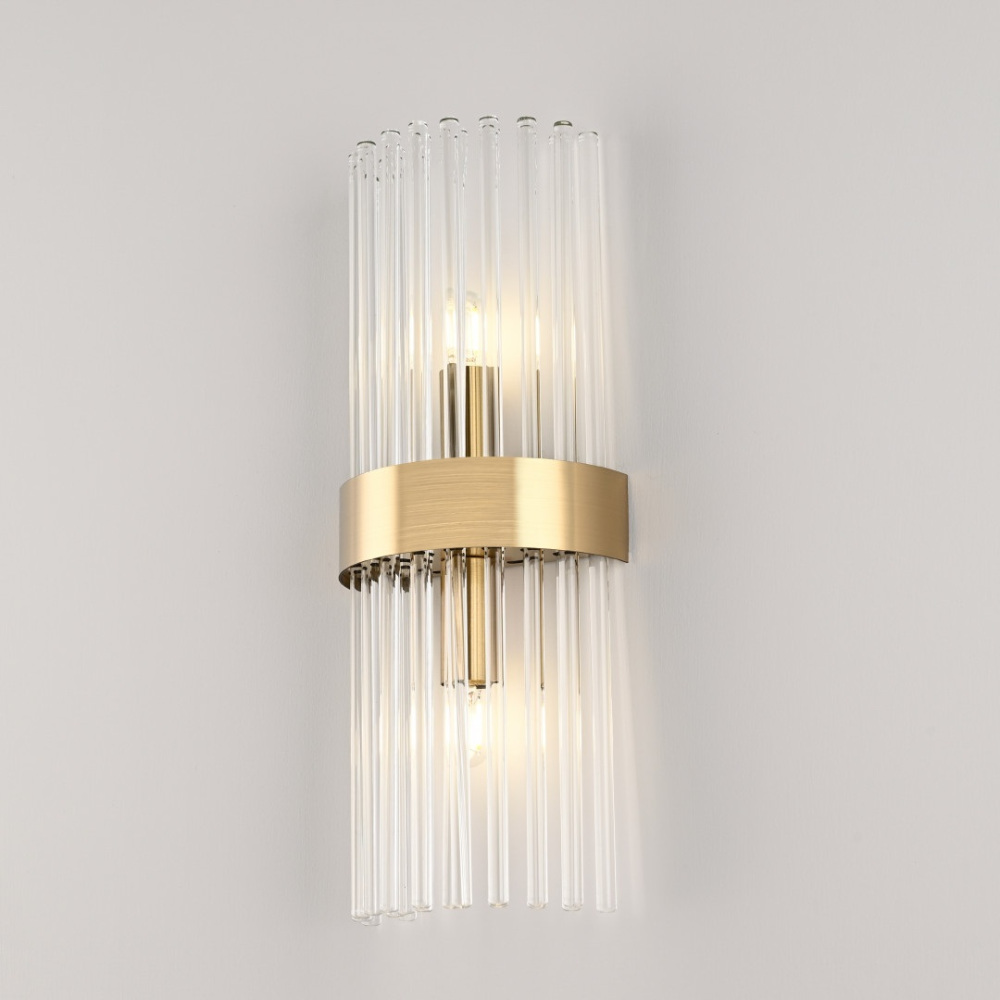 Корпус настенного светильника исполнен из прочного металл, цвет корпуса - золотой, цвет плафона - прозрачный, что придает этому светильнику изысканности.