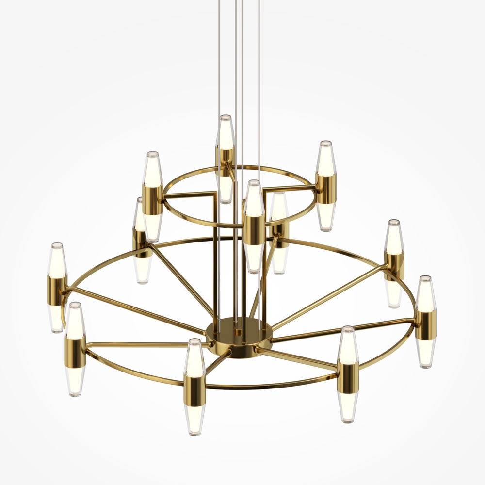 Продуманная конструкция — металлическая арматура с латунным покрытием и конусные рассеиватели из матового и прозрачного акрила — визуально «вытягивают» пространство и дают глубокий объём света. Монтаж на планку и поддержка сети 220–240 В упрощают установку, а высота подвеса регулируется в широких пределах (465–3365 мм) для точной подстройки под помещение.