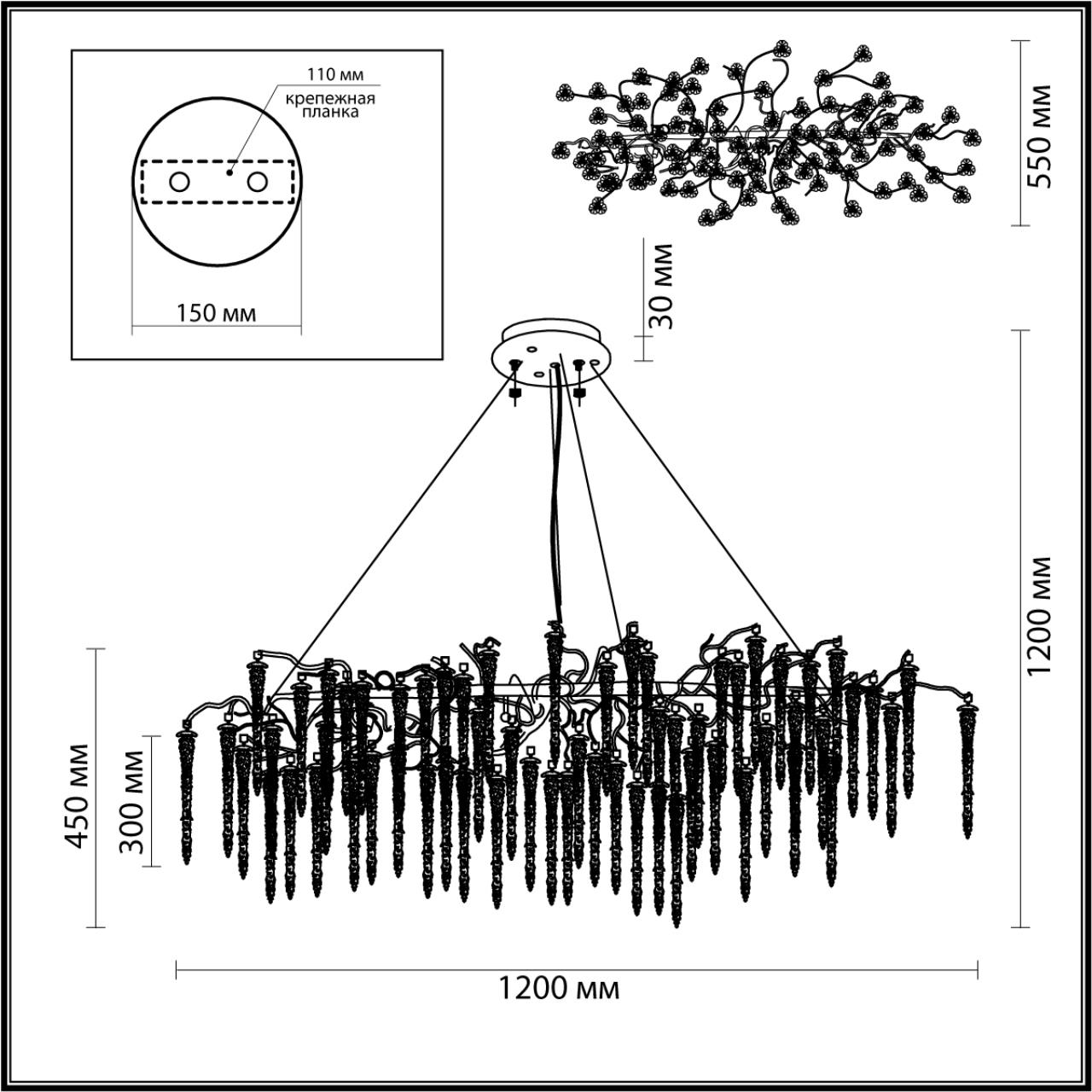 Размеры светильника: ширина 880 мм, высота 1200 мм. - такие габариты позволяют люстре гармонично смотреться как в просторных, так и в небольших помещениях.