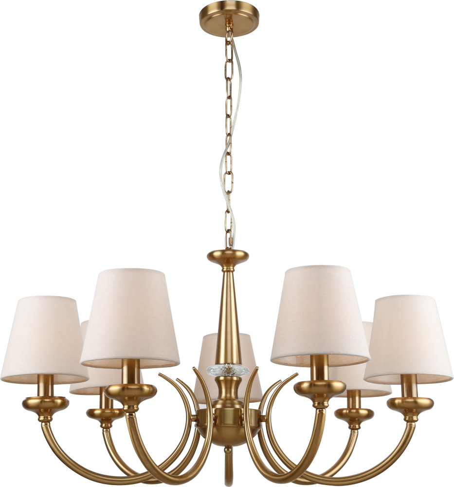 Каркас подвесной люстры выполнен из прочного металла, а латунный цвет добавит вашему интерьеру элегантности. Плафон выполнен в бежевом цвете, что добавляет модели легкости, изысканности и завершенность образа.