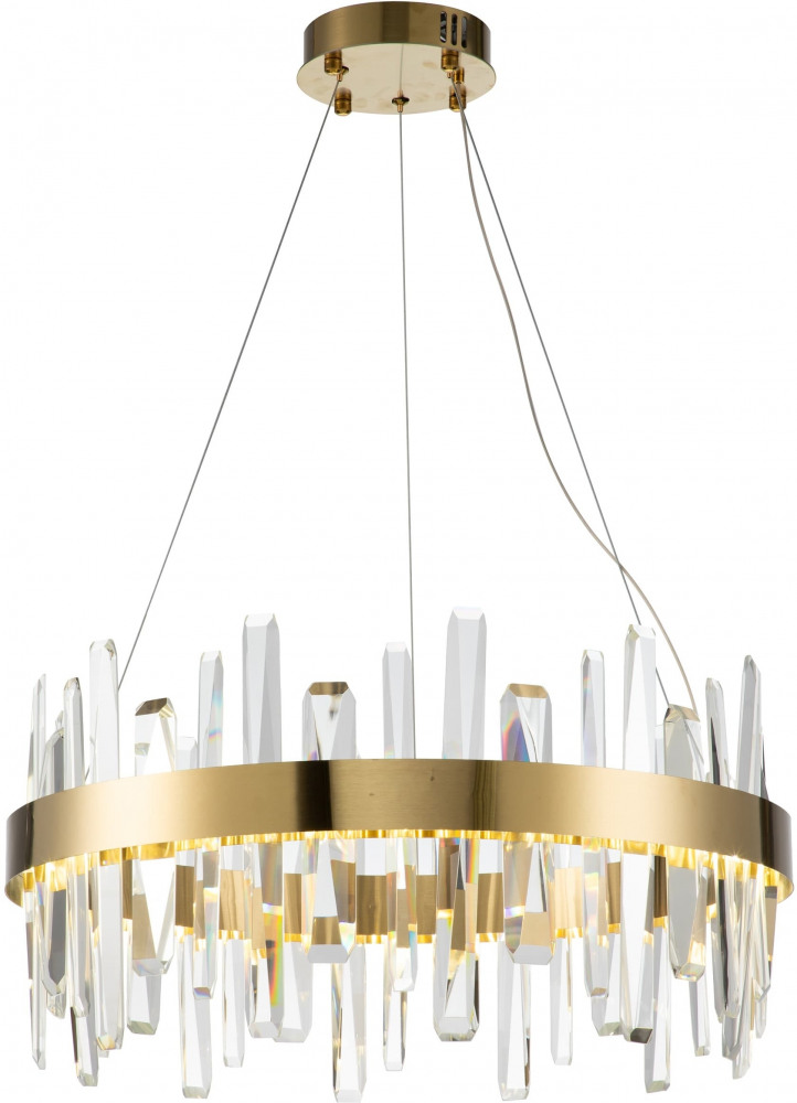Корпус подвесной люстры создан из прочного металла, а золотой цвет добавит вашему интерьеру теплоты. Плафон выполнен в прозрачном цвете, что добавляет модели легкости, элегантности и завершенность образа.
