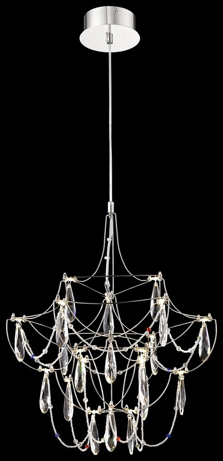 Корпус подвесной люстры исполнен из прочного металла, хрусталя, а никель/хромовый, прозрачный цвет добавит вашему интерьеру теплоты. Плафон выполнен в цвете, что добавляет модели легкости, элегантности и завершенность образа.