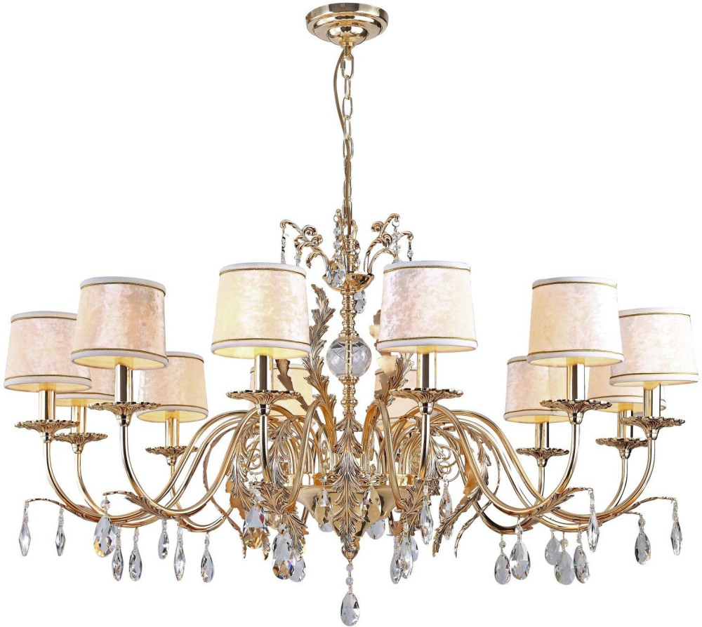 Модель рассчитана на 12 ламп с цоколем E14, поэтому свет получается равномерным и насыщенным — то, что нужно для большого помещения. Диаметр порядка 1200 мм и высота около 700 мм подчеркивают статусность люстры, а IP20 и питание 220 V соответствуют стандартной эксплуатации в жилых интерьерах. По данным поставщиков, для этой версии применены кремовые плафоны (обозначение CG), арматура — металл в золотом исполнении, масса около 17 кг, площадь эффективного освещения указывается до 40 м². Эти характеристики подтверждаются карточками товара у профильных продавцов и дистрибьюторов бренда, включая размеры, цоколь, мощность на лампу до 60 W и класс защиты IP20.