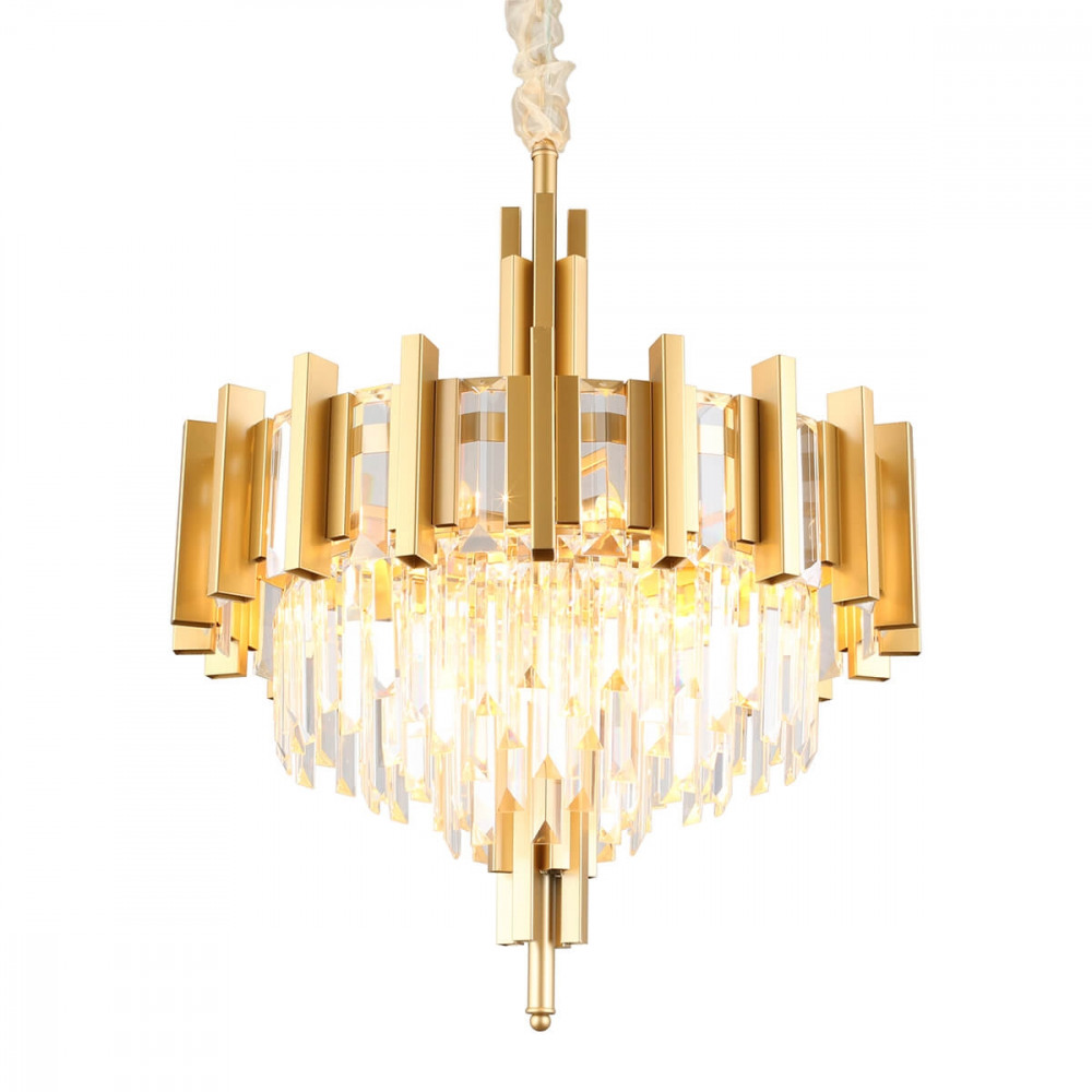 Каркас подвесной люстры сделан из надежного металла, а золотой цвет добавит вашему интерьеру теплоты. Плафон выполнен в прозрачном цвете, что добавляет модели легкости, благородства и завершенность образа.