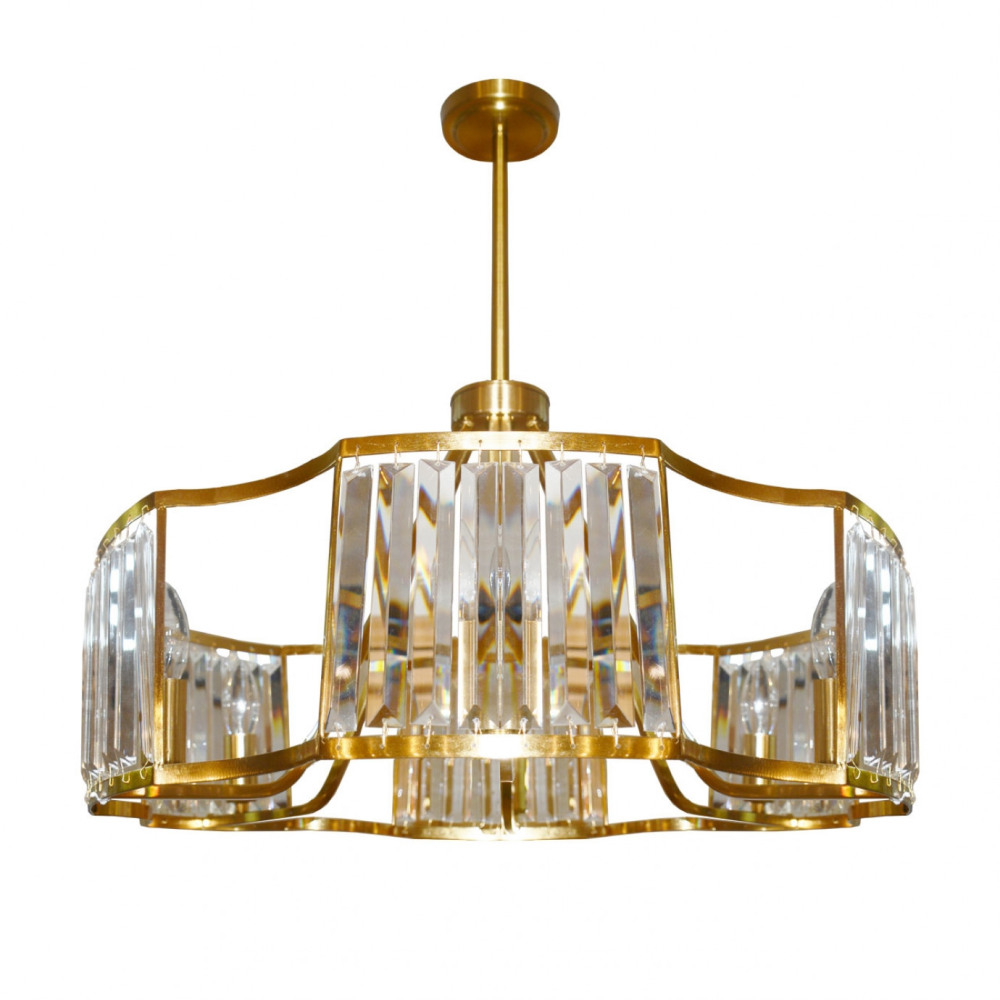 Корпус подвесной люстры сделан из прочного металла, а латунный цвет придаст вашему интерьеру теплоты. Плафон выполнен в прозрачном цвете, что добавляет модели легкости, элегантности и завершенность образа.