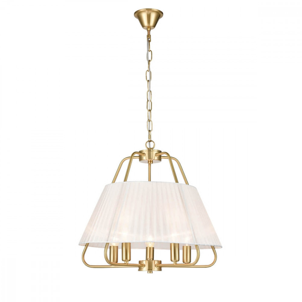 Каркас подвесной люстры исполнен из высококачественного металла, а золотой цвет придаст вашему интерьеру изысканности. Плафон выполнен в белом цвете, что добавляет модели легкости, изысканности и завершенность образа.