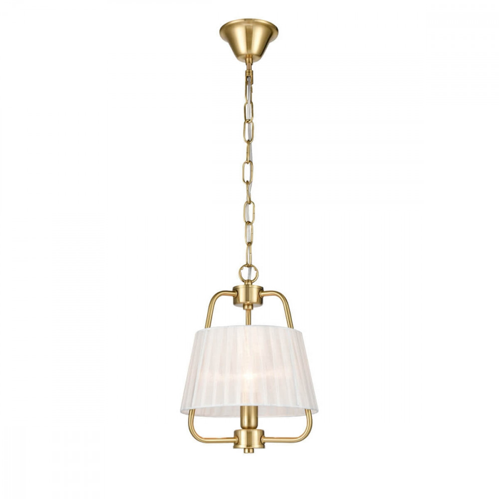 Каркас подвесной люстры исполнен из высококачественного металла, а золотой цвет придаст вашему интерьеру изысканности. Плафон выполнен в белом цвете, что добавляет модели легкости, изысканности и завершенность образа.
