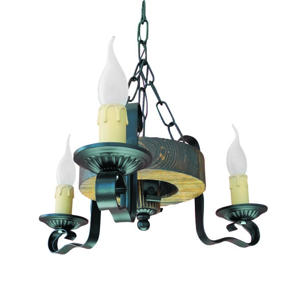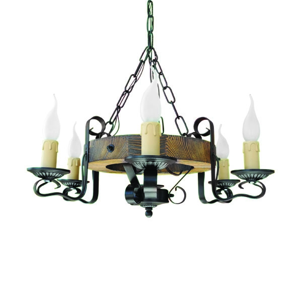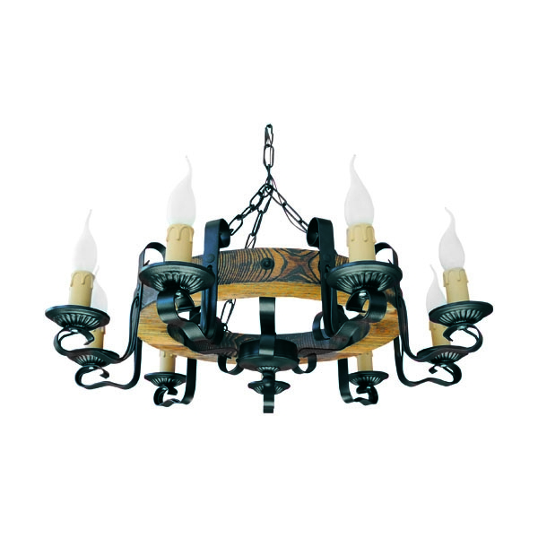Эта подвесная люстра создана для больших помещений и «второго света»: массив дерева в сочетании с цепным подвесом и открытыми «свечами» формирует характерный замковый образ и тёплое камерное освещение. Такой светильник органично впишется в классический интерьер, кантри и стилизацию под средневековый зал, подчёркивая архитектуру пространства.