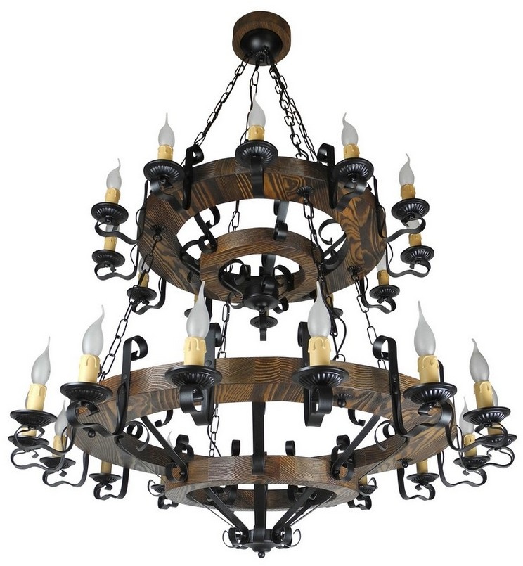 В отличие от типовой люстры на штанге, здесь используется надежная люстра на цепи — решение, которое лучше распределяет нагрузку и позволяет варьировать подвес. Отсутствие плафонов усиливает световой поток и подчёркивает графику кованых деталей и текстуру дерева, а суммарная мощность рассчитана на освещение действительно больших залов.