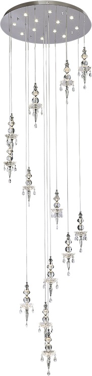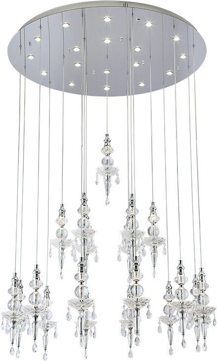 Главная особенность модели — комбинированная световая схема: 12 заменяемых ламп GU4 по 5 Вт дополняют интегрированные LED‑модули, что в сумме даёт 86 Вт света и эффект глубины в каждом кристалле. В отличие от многих «чисто диодных» светильников, здесь легко обновить основной свет за счёт стандартных капсул, сохранив при этом фирменное свечение подсветки. Диаметр 800 мм помогает уверенно зонировать пространство и подчеркивает статус интерьера.