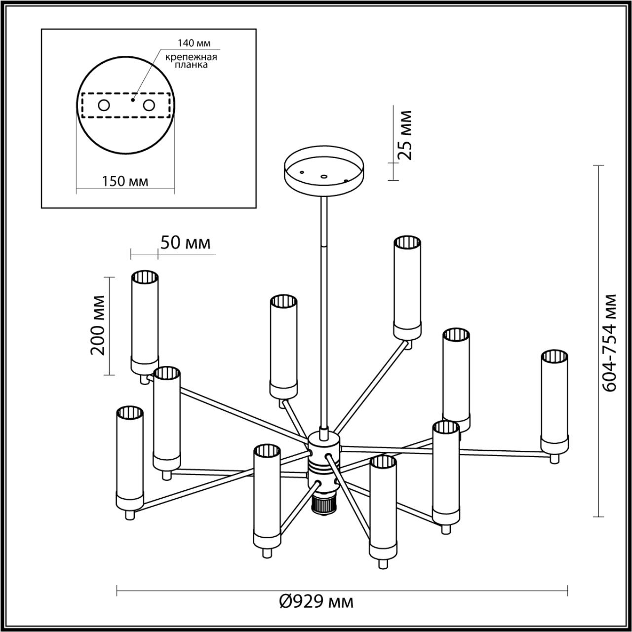 Размеры светильника: ширина мм, высота 604-754 мм. - такие габариты позволяют люстре идеально смотреться как в просторных, так и в небольших помещениях.