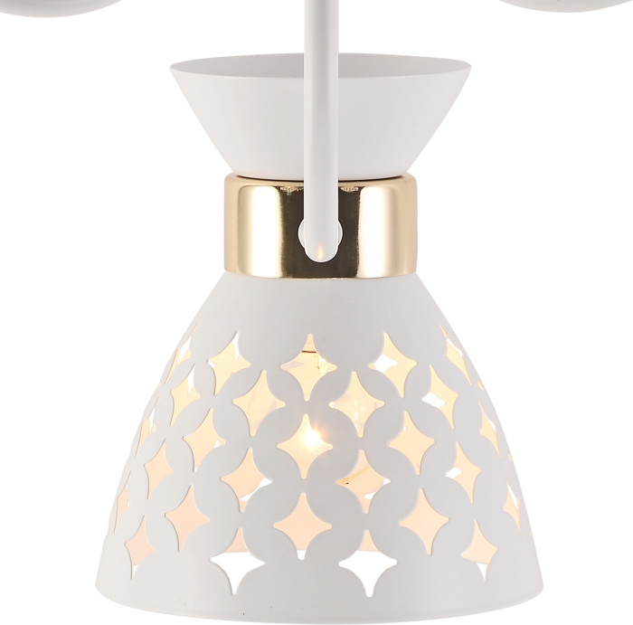 Корпус потолочной люстры реализован из надежного металла, что добавляет ей прочности и долговечности. Плафон в белом, золотом цвете придаёт модели лёгкости, изысканности и завершенности, благодаря чему люстра станет настоящим украшением вашего интерьера.