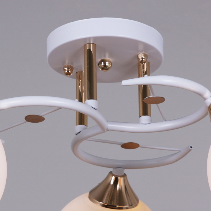 Корпус потолочной люстры изготовлен из надежного металла, что добавляет ей прочности и долговечности. Плафон в белом, золотом цвете придаёт модели лёгкости, элегантности и завершенности, благодаря чему люстра станет настоящим украшением вашего интерьера.
