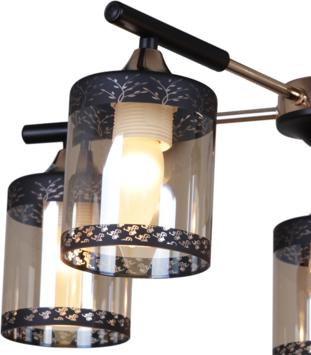 Корпус потолочной люстры сделан из высококачественного металла, что добавляет ей прочности и долговечности. Плафон в чёрном, янтарном цвете придаёт модели лёгкости, элегантности и завершенности, благодаря чему люстра станет настоящим украшением вашего интерьера.