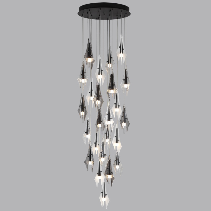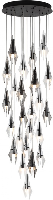 Эта люстра создана для выразительных интерьеров: каскад из 24 стеклянных подвесов образует «водопад» мягкого света, а строгая черная арматура подчеркивает современный характер. Теплое свечение 3000 K с высоким световым потоком 11620 лм комфортно наполняет пространство и не утомляет глаза.