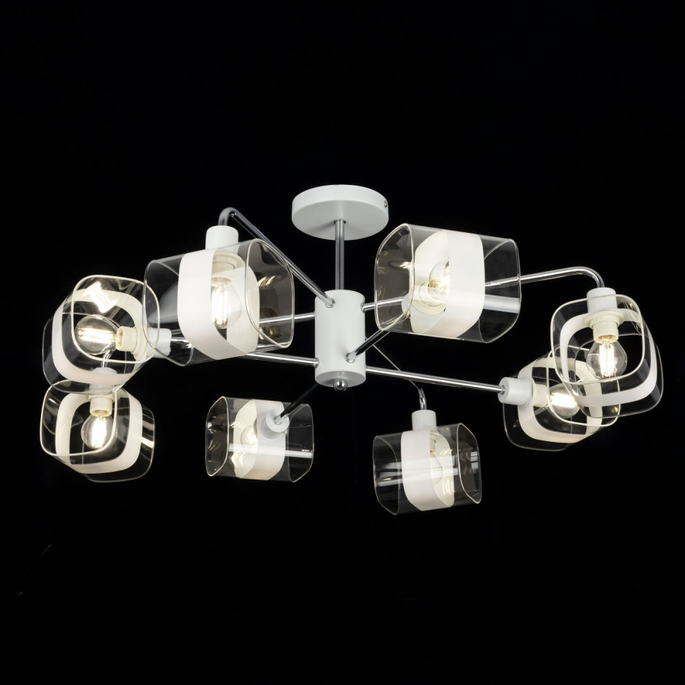 Для создания приятного освещения в светильнике предусмотрены лампочки в количестве 8 шт. с цоколем E14 и общей мощностью 480 Вт., благодаря чему обеспечивается яркое освещение для помещений площадью до 25 кв.м.