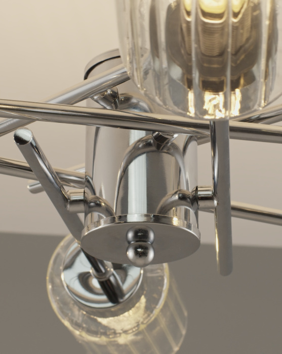 Каркас потолочной люстры реализован из прочного металла, что добавляет ей прочности и долговечности. Плафон в прозрачном цвете придаёт модели лёгкости, элегантности и завершенности, благодаря чему люстра станет настоящим украшением вашего интерьера.