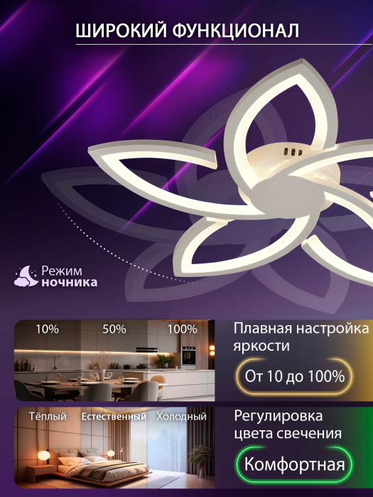 Для создания комфортного освещения в светильнике предусмотрены лампочки в количестве шт. с цоколем LED и общей мощностью 120 Вт., благодаря чему обеспечивается мягкое освещение для помещений площадью до 18 кв.м.
