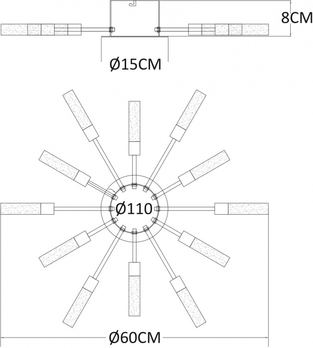 Размеры светильника: ширина 600 мм, высота 80 мм. Такие габариты позволяют люстре гармонично вписываться как в просторные, так и в небольшие помещения.