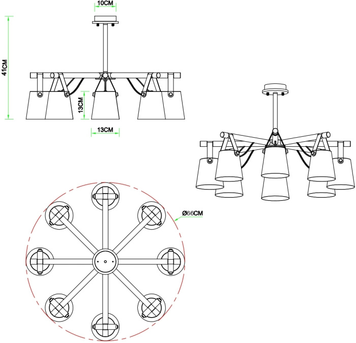 Для создания комфортного освещения в светильнике предусмотрены лампочки в количестве 8 шт. с цоколем E27 и общей мощностью 480 Вт., благодаря чему обеспечивается хорошее освещение для помещений площадью до 18 кв.м.