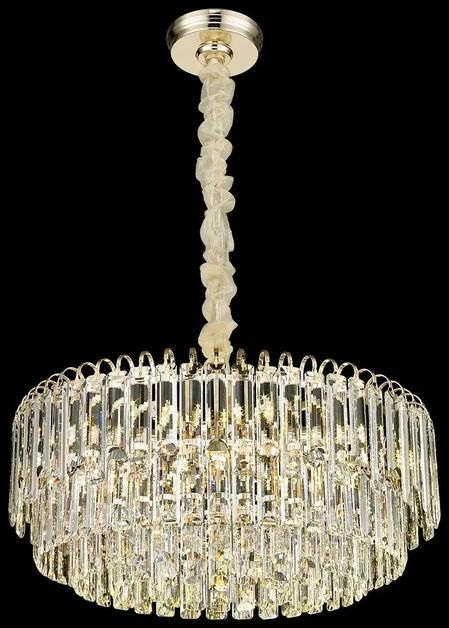 Корпус хрустальной люстры создан из высококачественного металла, золотой цвет добавляет в ваш интерьер глубину. Плафон в прозрачном цвете подчеркивает общую композицию, добавляя модели изящество и элегантность.