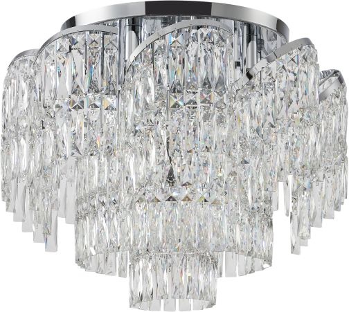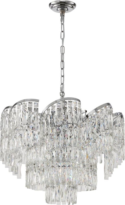 Каркас хрустальной люстры выполнен из высококачественного металла, никель/хромовый цвет привносит в ваш интерьер глубину. Плафон в прозрачном цвете завершает общую композицию, добавляя модели воздушность и утонченность.
