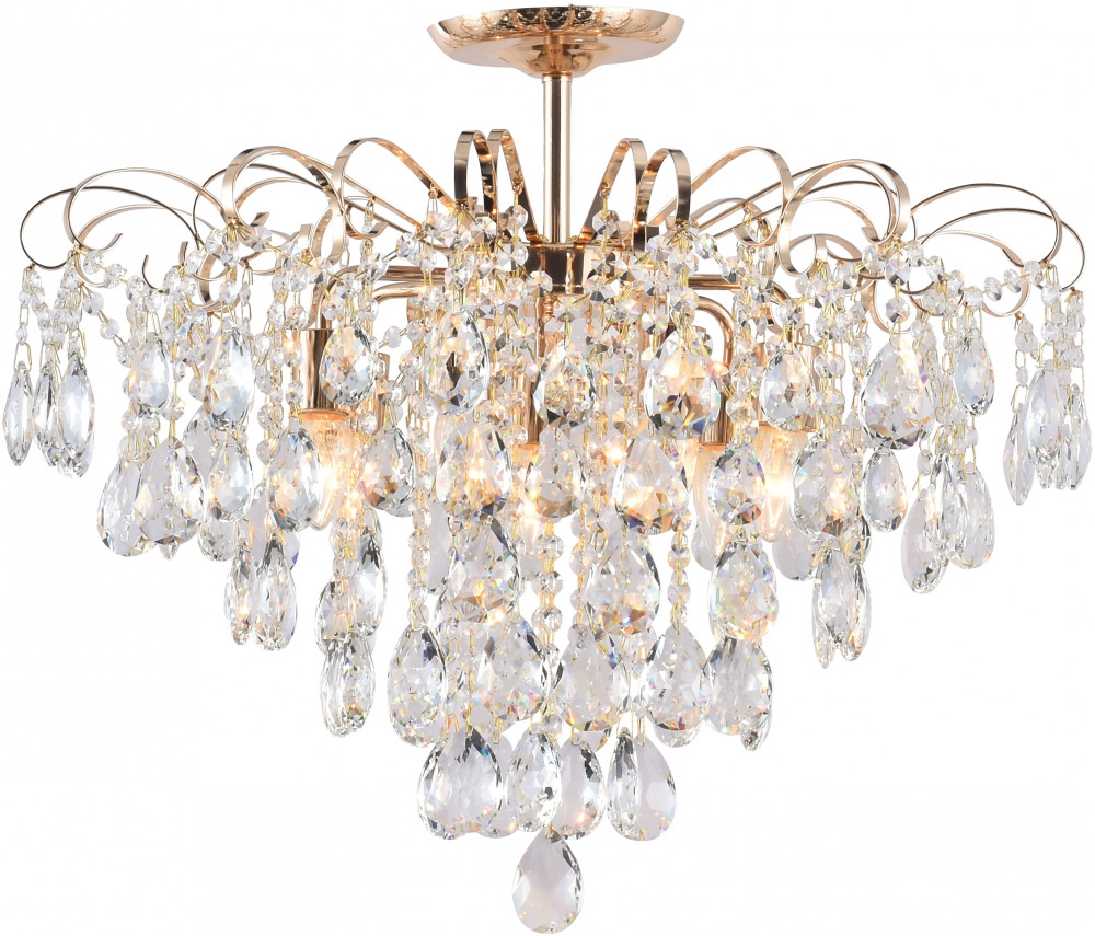 Каркас хрустальной люстры изготовлен из надёжного металла, золотой цвет придает в ваш интерьер элегантность. Плафон в прозрачном цвете завершает общую композицию, добавляя модели воздушность и элегантность.