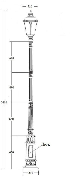 В этой модели уличного фонаря установлены лампы в количестве 1 шт. с цоколем E27, общей мощностью 100 Вт.