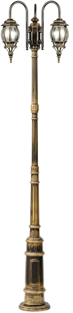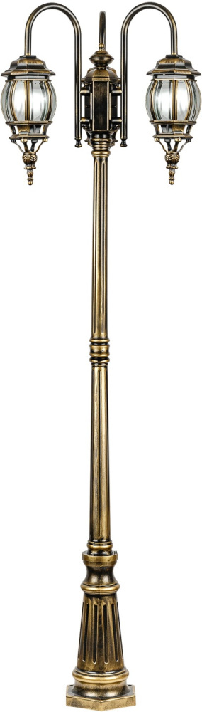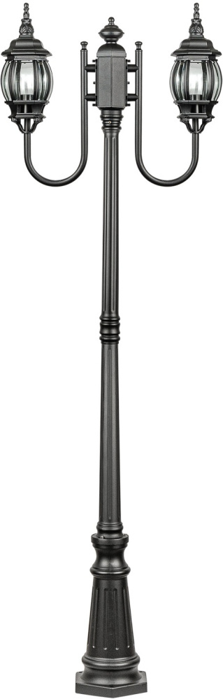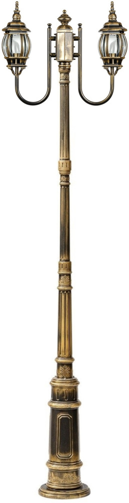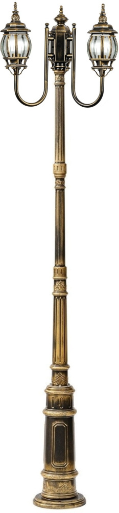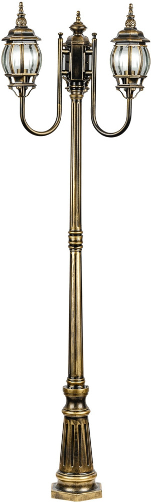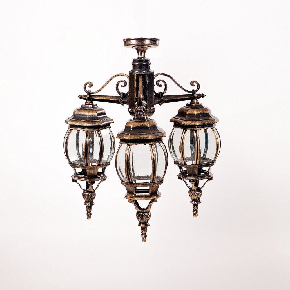 Светильник оснащен тремя прозрачными стеклянными плафонами, каждый из которых рассчитан на лампу с цоколем E27 мощностью до 100 Вт. Общая мощность составляет 300 Вт, что позволяет эффективно освещать площадь до 15 квадратных метров. Благодаря степени защиты IP44, модель устойчива к воздействию влаги и пыли, что делает ее идеальной для использования на улице.