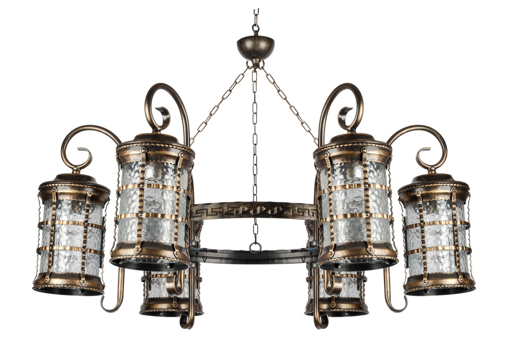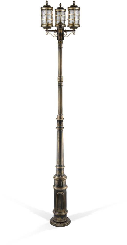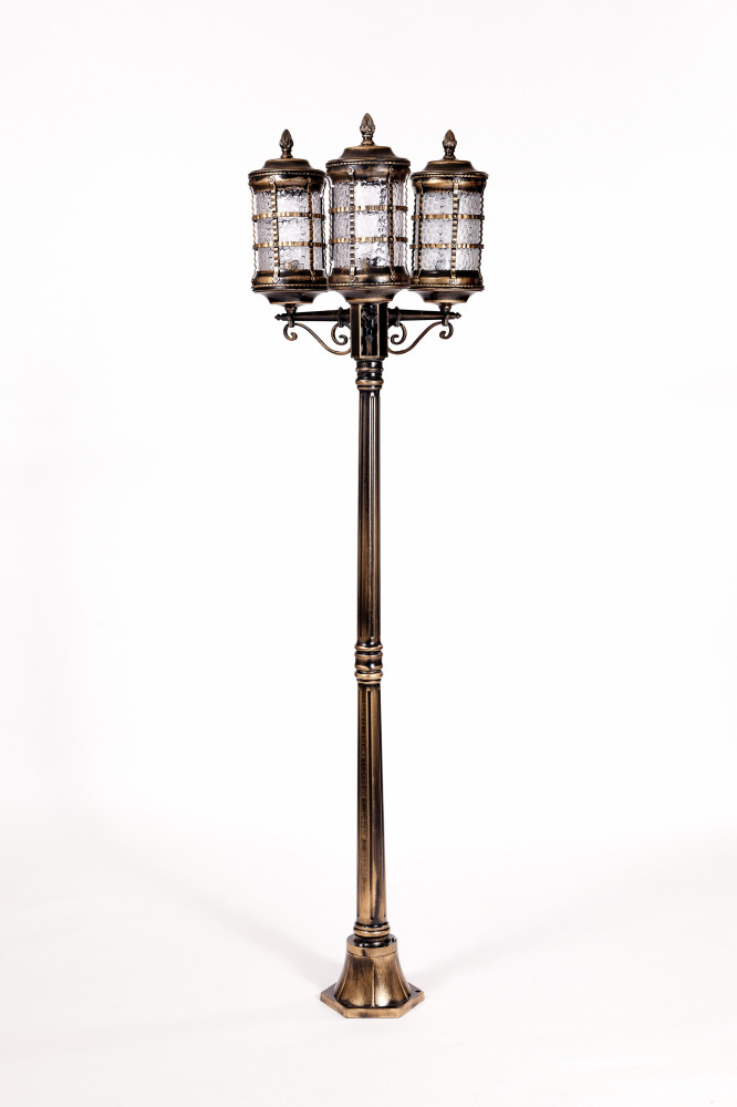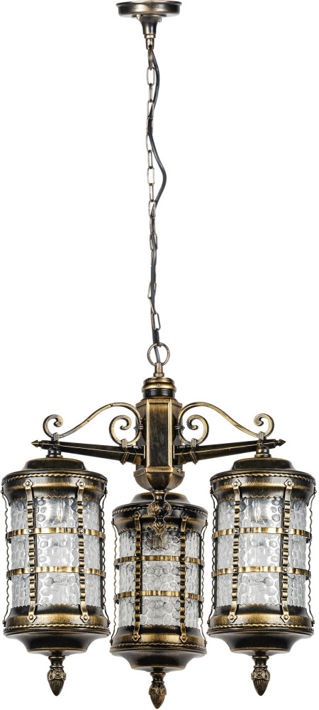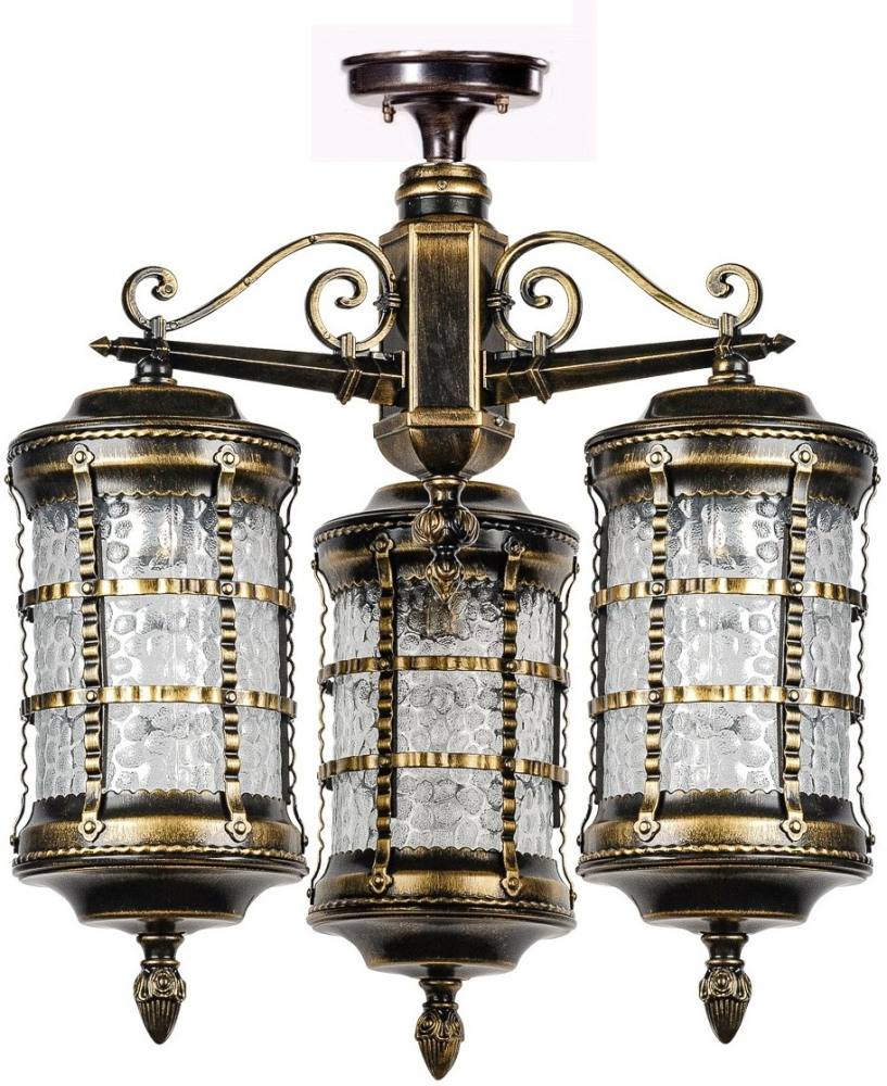 Светильник оснащён тремя плафонами из прозрачного стекла, которые равномерно рассеивают свет, создавая комфортную атмосферу на площади до 15 квадратных метров. Металлическая арматура с патинированной поверхностью не только придаёт изделию благородный вид, но и обеспечивает долговечность конструкции.