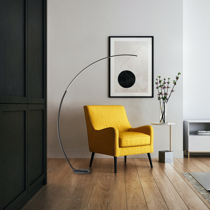 Размеры этого торшера – ширина 250 мм., высота 1700 мм. Он идеально впишется для комнаты площадью до 4 квадратных метров. Для создания подходящего освещения здесь использовано 1 ламп с цоколем LED и общей мощностью 15 Вт.