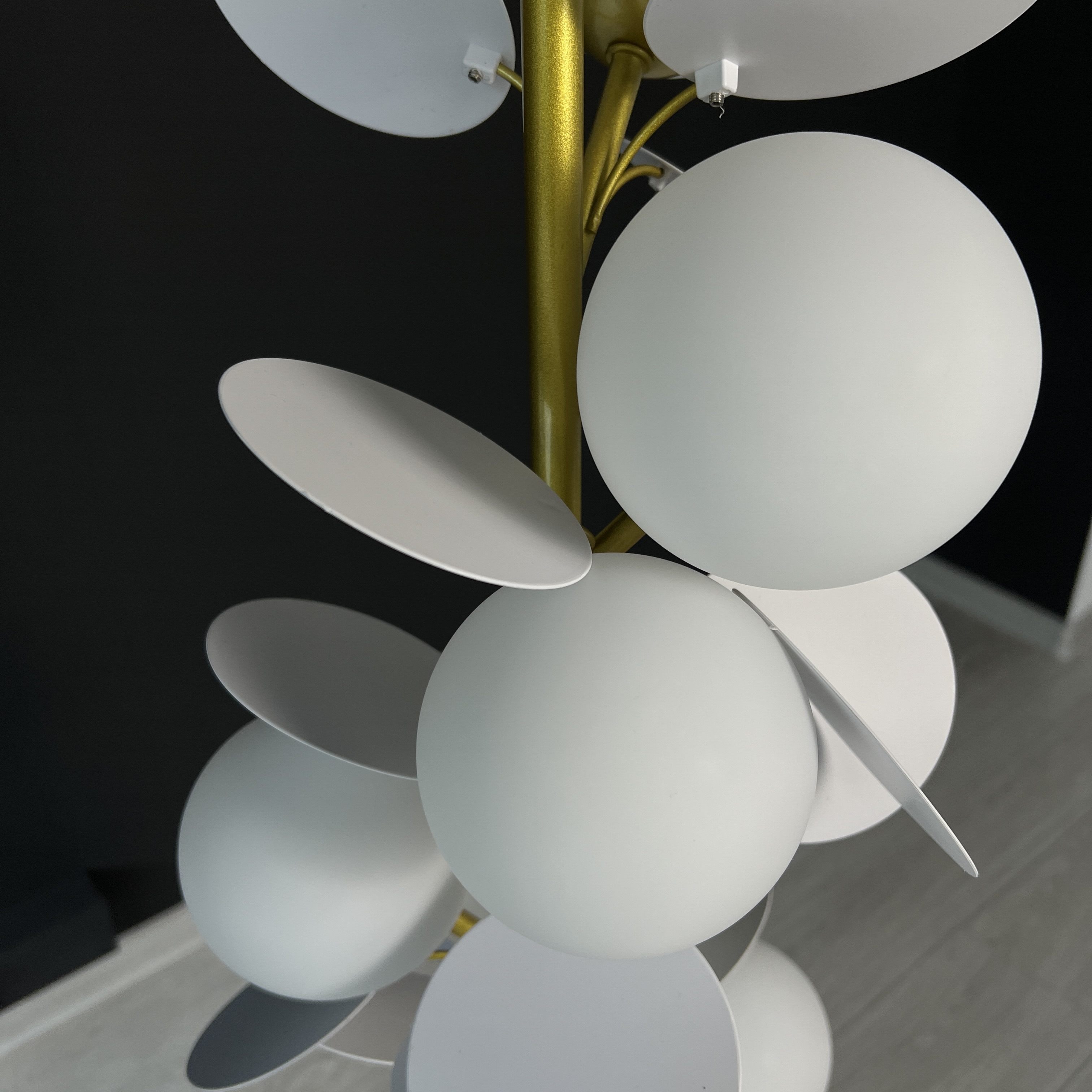 Размеры этого торшера – ширина 270 мм., высота 1500 мм. Он идеально впишется для комнаты площадью до 20 кв.метров. Для создания приятного освещения здесь использовано 10 ламп с цоколем G9 и общей мощностью 400 Вт.