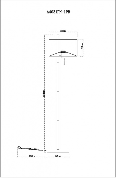 Размеры этого торшера – ширина 360 мм., высота 1580 мм. Он идеально подойдёт для комнаты площадью до 2 кв.метров. Для создания приятного освещения здесь использовано 1 ламп с цоколем E27 и общей мощностью 60 Вт.